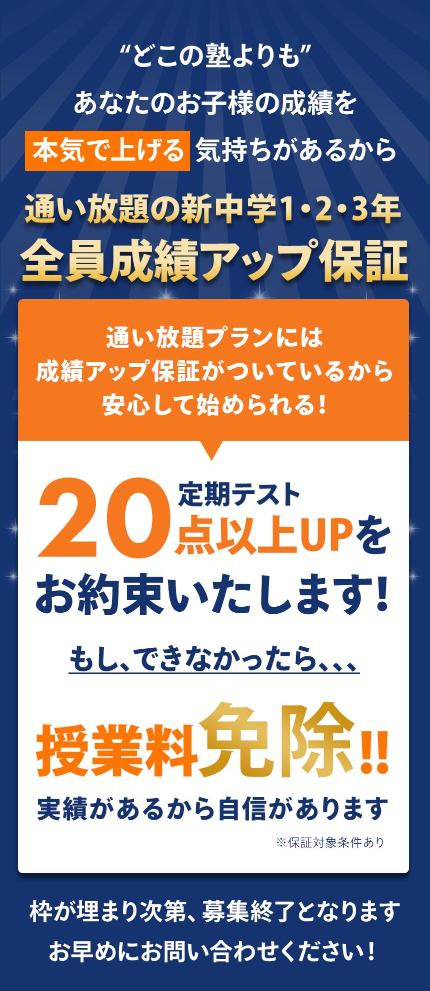 私たちは、指導の質と結果に絶対の自信を持っています。 もし定期テストで「+20点以上」のスコアアップが実現できなければ、授業料はいただきません。せっかくお通いいただくからこそ、私たちは「目に見える結果」でその期待にお応えします。